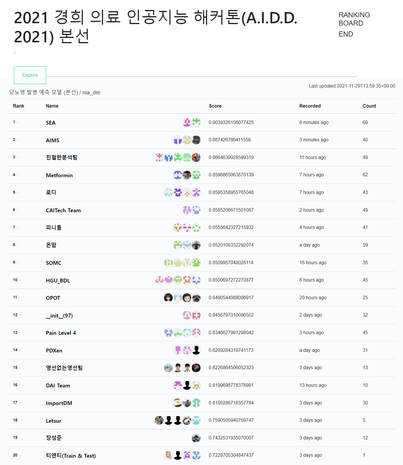 이게 본선 리더보드인데요~ 2 위에 랭킹되어있는 AIMS 가 저희 팀입니다!