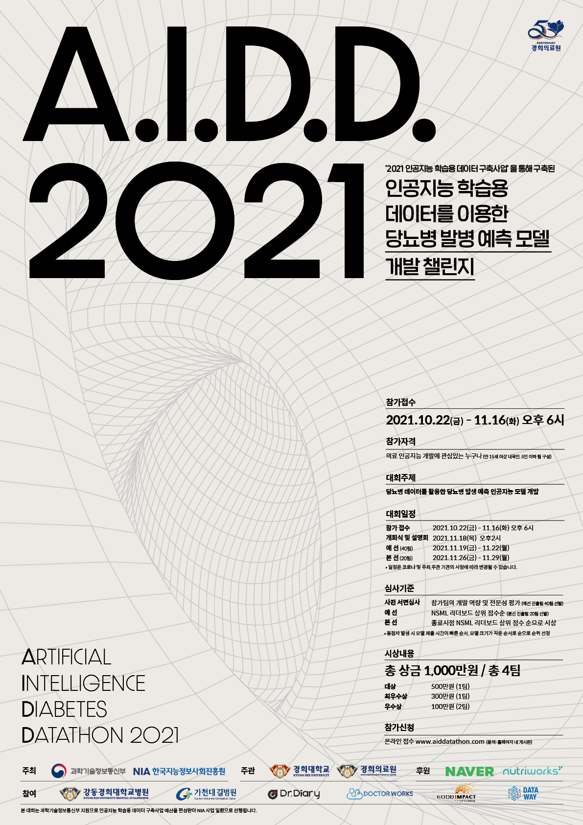 AIDD는 과학기술정보통신부, 한국지능정보사회진흥원이 주최하고 경희의료원이 주관한 인공지능 데이터톤입니다!