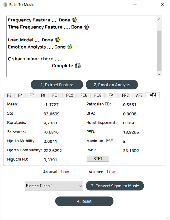 - "4. Reset" 버튼을 눌러 초기화 한 뒤, 다른 EEG Signal에 대해 1~5번 순서를 반복하여 또 다른 음악을 작곡할 수 있음.