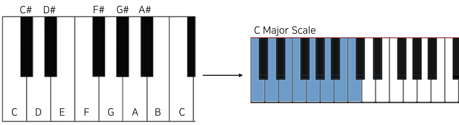 Valence model로 예측한 결과가 High, MPSF Scaling 결과 C chord에 가장 가깝다면, "C Major Scale"을 이용해 작곡