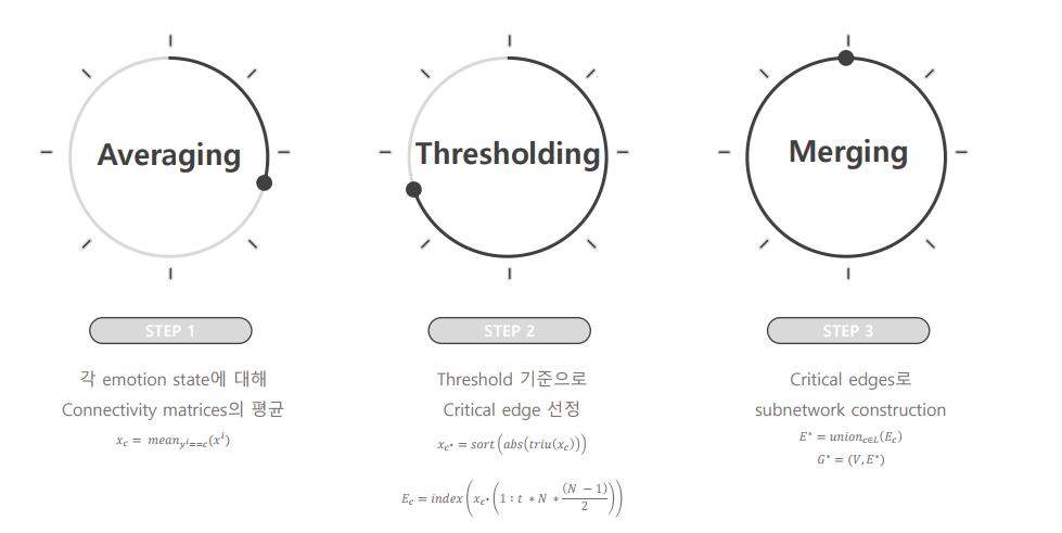 Averaging 에서는 각 emotion state 별, 그리고 주파수 별로 connectivity metrics의 평균을 낸다. 이렇게 하면 5가지 emotion 에 대해, 그리고 한 emotion당 5가지 주파수에 대해 Metrics 가 할당되게 된다.