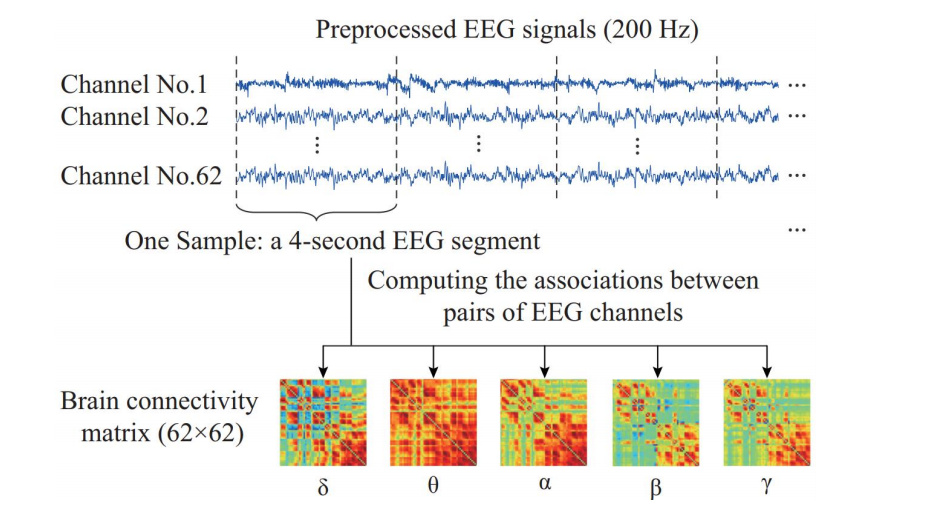 1. 먼저 EEG signal data를 주파수 대역대(알파, 델타, 베타, 세타, 감마)로 나누어 4초 간격으로 잘라서, 64x64 의 Dynamic Brain connectivity Metrics 를 형성한다. (connectivity Metrics 란 네트워크 Metrics로, 각 채널을 vertex로 두고 신호와 신호의 상관(연결)관계를 나타내는 Metrics이다.) 이렇게 하면 결과적으로 5 종류의 64x64 Metrics 여러 장을 얻게 된다.