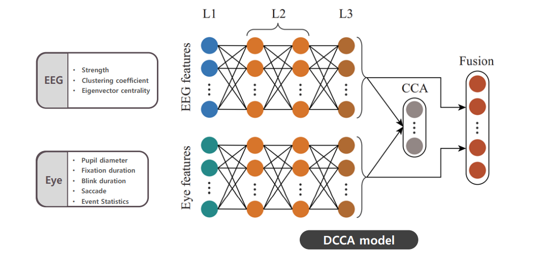 논문에서는 해당 matrics에서 feature를 추출한다. 아래의 그림과 같이 EEG(matrics)에서 3종류, Eyetracking data에서 5종류를 추출한다. 연구진은 이렇게 추출한 EEG, Eyetracking feature를 fusion 하여 최종 feature를 재구성하는데, 이 과정에서 사용한 model을 DCCA라고 부른다.