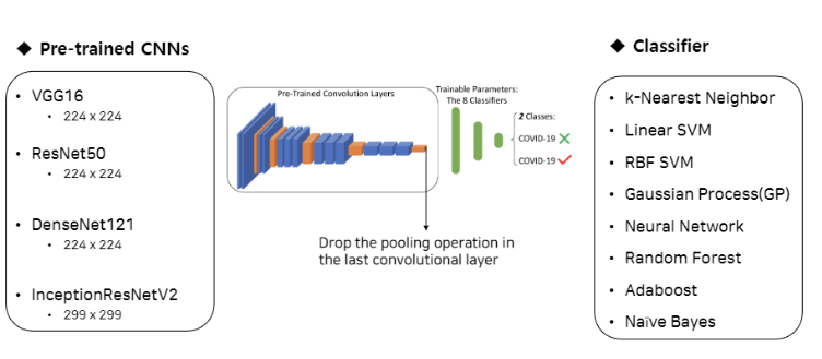 연구에서는 CNN을 이용한 사전학습모델로 상기 4가지 모델을 사용했고, Classifier로는 다음의 8가지 모델을 사용했습니다. 최종 모델의 앞부분은 사전학습모델의 Convolution layer를 그대로 가져와서 가중치를 사용하였고, 뒷부분은 Covid classification을 위한 classifier를 사용하였습니다.