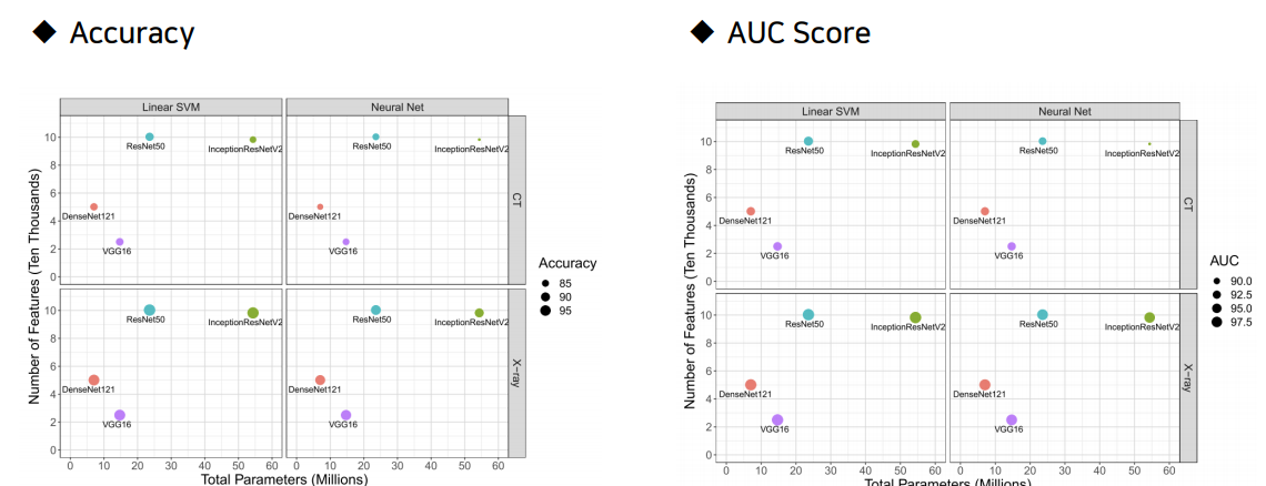 연구진은 추가적으로, 각 모델별로 추출되는 feature 및 파라미터의 갯수 또한 비교하였는데요. 그래프의 원은 pre-trained CNN 모델이며, 원의 크기는 Accuracy를 의미합니다. VGG16 모델은 적은 파라미터 및 feature 갯수에 비해 높은 정확도, AUC 값을 가지고 있고(Most informative& Discriminative), InceptionResNetV2는 높은 파라미터 및 feature 갯수에 비해 낮은 정확도, AUC 값을 가지고 있습니다. (Least informative & Discriminative features)