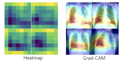 gradient-weighted class activation mapping 그림입니다. Backpropagating 한 결과를 HeatMap 으로 그려 X-ray 사진에 HeatMap을 덧씌운 그림입니다. 모델이 데이터를 분류할때 어느 부분이 중요하게 영향을 끼쳤는지 확인이 가능합니다.