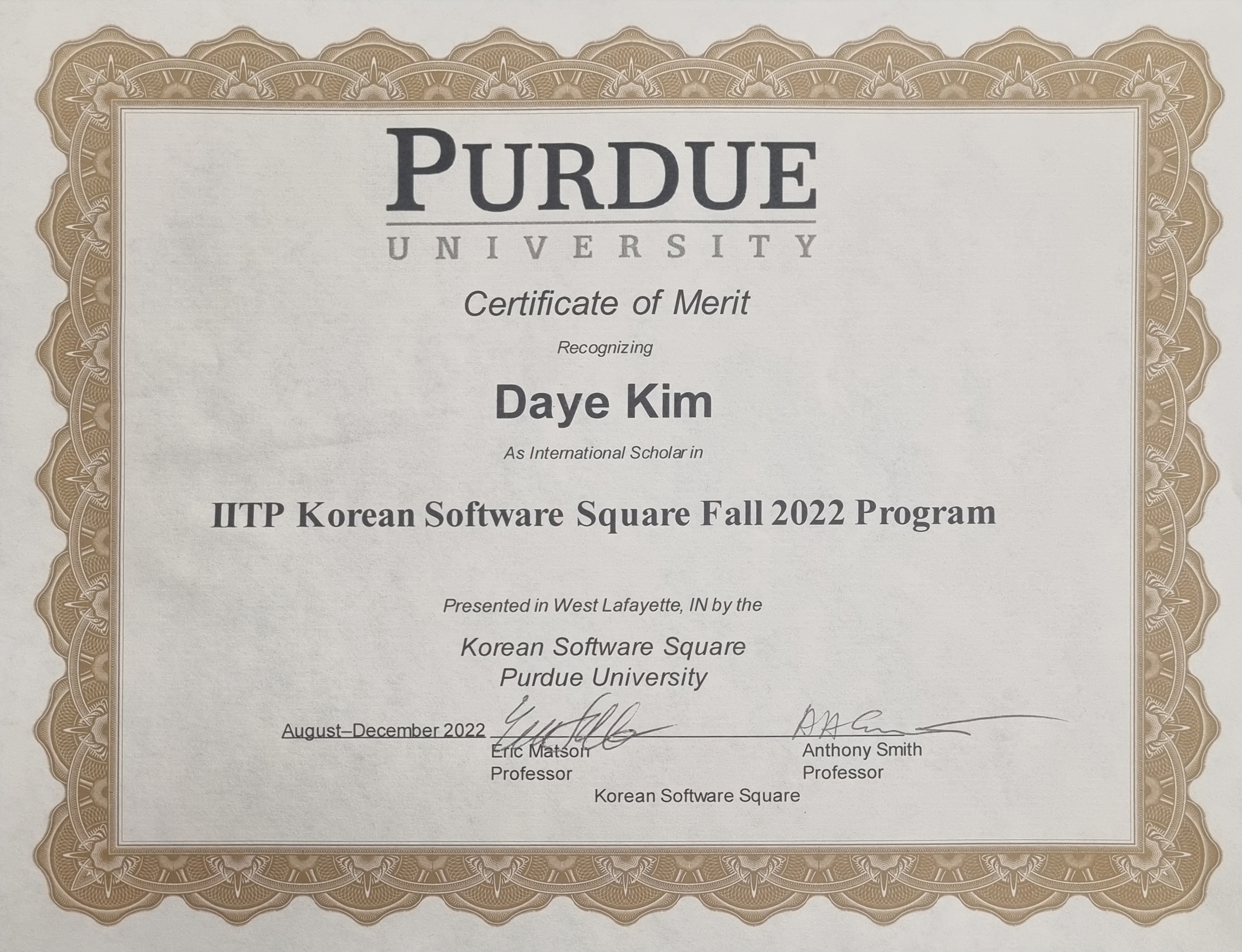 고민하지 말고 무엇이든 도전해보아야겠다는 생각을 하게 되었습니다. 한국에서만 지내다 보니 외국, 특히 미국에 가서 연구한다는 것이 이루지 못할 꿈만 같이 느껴졌었는데, 미국 퍼듀 대학교에 가서 4개월동안 많은 사람을 만나고, 이야기를 듣고, 현지 교수님과 함께 프로젝트를 하다 보니 충분히 ‘나’는 미국에서 제 몫을 다하며 연구하고 생활할 수 있으며, 미국 대학원에서 공부하는 것은 꿈꾸기만 하던 이상향이 아니라 스스로 노력을 통해 닿을 수 있는 현실임을 체감할 수 있었습니다. 흔히 말하는 세상을 보는 시야가 넓어진다는 것이, 상상만 할 수 있던 일들이 나의 현실이 될 수 있음을 인지하고, 앞으로 살아감에 있어 더 넓은 세상의 일들을 고민하고 고려하여 삶에 반영할 수 있게 되는 것임을 깨달았습니다. 그런 의미에서, 저는 이 프로그램을 통해 더 넓은 세상을 볼 수 있게 되었습니다. 이 시야를 가지고 더 넓은 세계에 끊임없이, 고민없이 도전할 것입니다. 이 프로그램은 제게 단순히 인생에서 한번 두고두고 회자할 좋은 추억이 아니라, 더 넓은 세상에서 더 많은 추억들을 만들게 해줄 첫 발자취라고 생각하며, 앞으로 변화된 삶을 살아갈 것입니다.