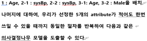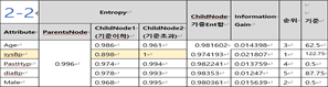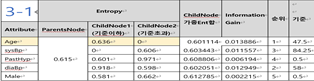 * 계산 예시) <1의 “Age”> ChildNode1 Entropy : -(73/373)*LOG(73/373,2)-(300/373)*LOG(300/373,2) = 0.713 /// ChildNode 가중 Entropy합(가중평균) : (373/788)*0.713 + (415/788)*0.996 = 0.862042 /// Information Gain = 0.921 – 0.862042 = 0.058958