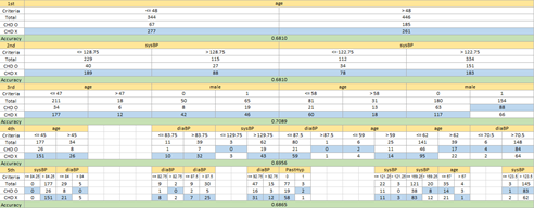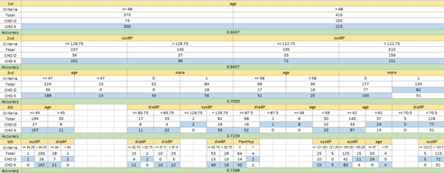 그 후 의사결정나무에 holdout data, 즉 test set을 넣어 다시 accuracy를 측정하였다. 마찬가지로 5-11로 예를 들면, training set을 가지고 예측한 model에서는 sysBP가 169.25 이하일 경우, 심장병을 앓지 않을 것이고, sysBP가 169.25초과일 경우에 심장병을 앓을 것이라고 예측했지만 test set을 넣었을 때는 sysBP가 169.25 초과일 경우 심장병을 앓는 사람이 더 많음을 볼 수 있다. 이 때의 accuracy는 (83+8)/141=0.6454이고 같은 방식으로 depth=5의 accuracy를 계산하면 0.6865가 나온다. 다른 depth의 accuracy를 계산한 과정은 다음과 같다. (자세한 사항은 첨부 파일 참고)