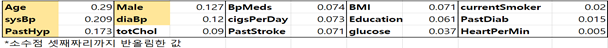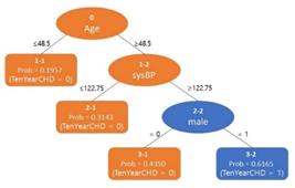 Probability=82/(51+82)=0.6165 ≥0.5이므로 leaf node의 class label은 TenYearCHD = 1