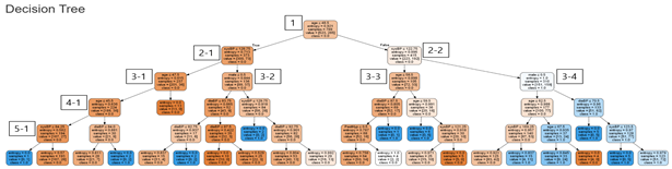 Ⅳ-1. 모델&그래프 해석Fitting Graph를 보면 Training & Test dataset 모두 Node depth <=2일 때 일정한 Accuracy를 갖는데 그 이유는 수립된 1차 모델이 Node depth <=2에서 leaf node 가 모두 0으로 labeled되기 때문. 이후, 모델 복잡도가 높아질수록 모델이 Training set을 잘 반영하는 반면, Node depth = 3을 기점으로 Test set의 Accuracy 증감이 변함. 본 보고서에서는 그 기점인 node depth = 3을 SweetSpot이라 간주하고 가지치기를 실시.