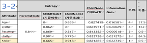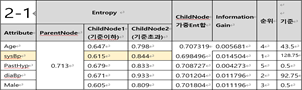 분기마다 5개의 Attribute에 대한 Information Gain을 구해서 1순위 Attribute를 분류기준으로 사용. ( I,II :각각의 분류 기준은 데이터분석 툴(Brightics Studio)의 Best Split 기준을 참고하여 결정함.)