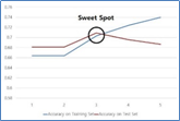 x축을 depth(모델 복잡도), y축을 accuracy라 하고 training set과 test set의 accuracy를 그래프로 나타내면 다음과 같고, over-fitting이 시작되는 sweet spot은 depth가3일 때라는 것을 알 수 있다.