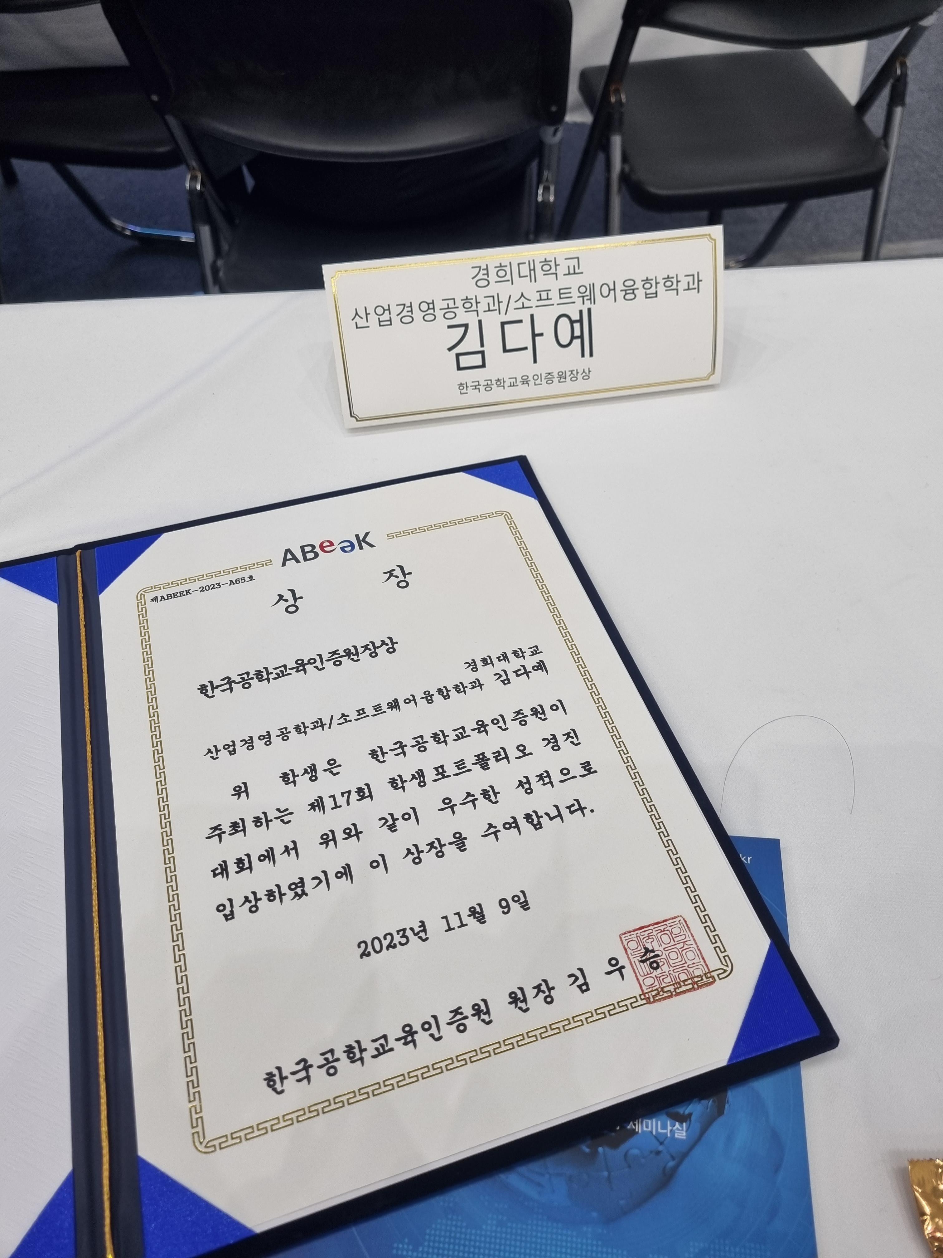 각 분야 수상자 4명 중, 위에 2명이 공학교육인증원상, 밑에 2명이 공과대학어쩌고상이었다. (공학교육인증원상이 더 높은 상!!)